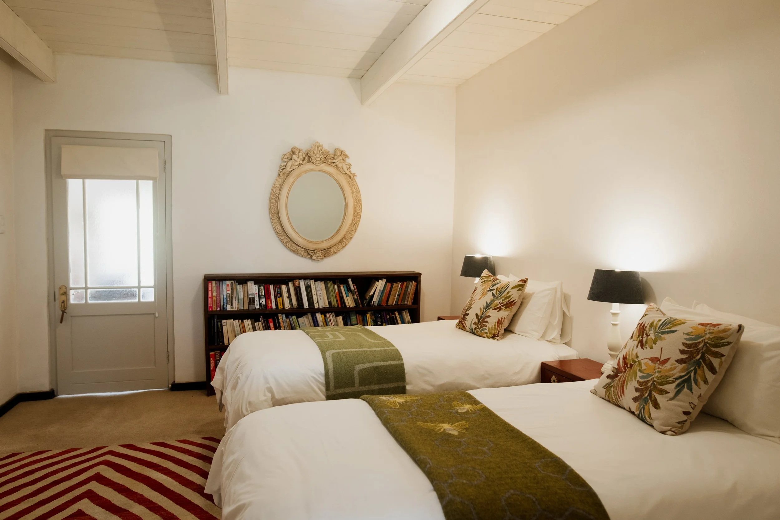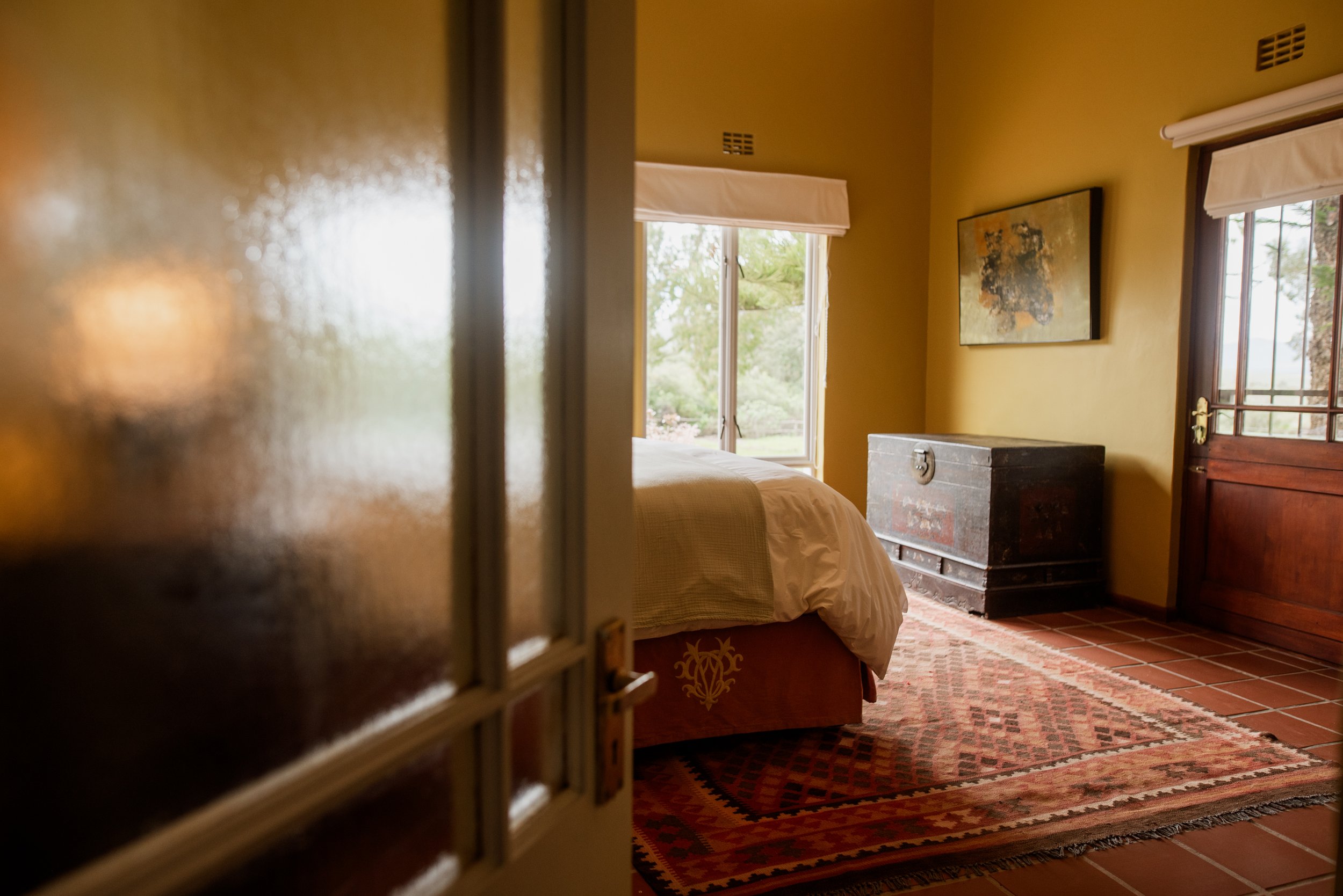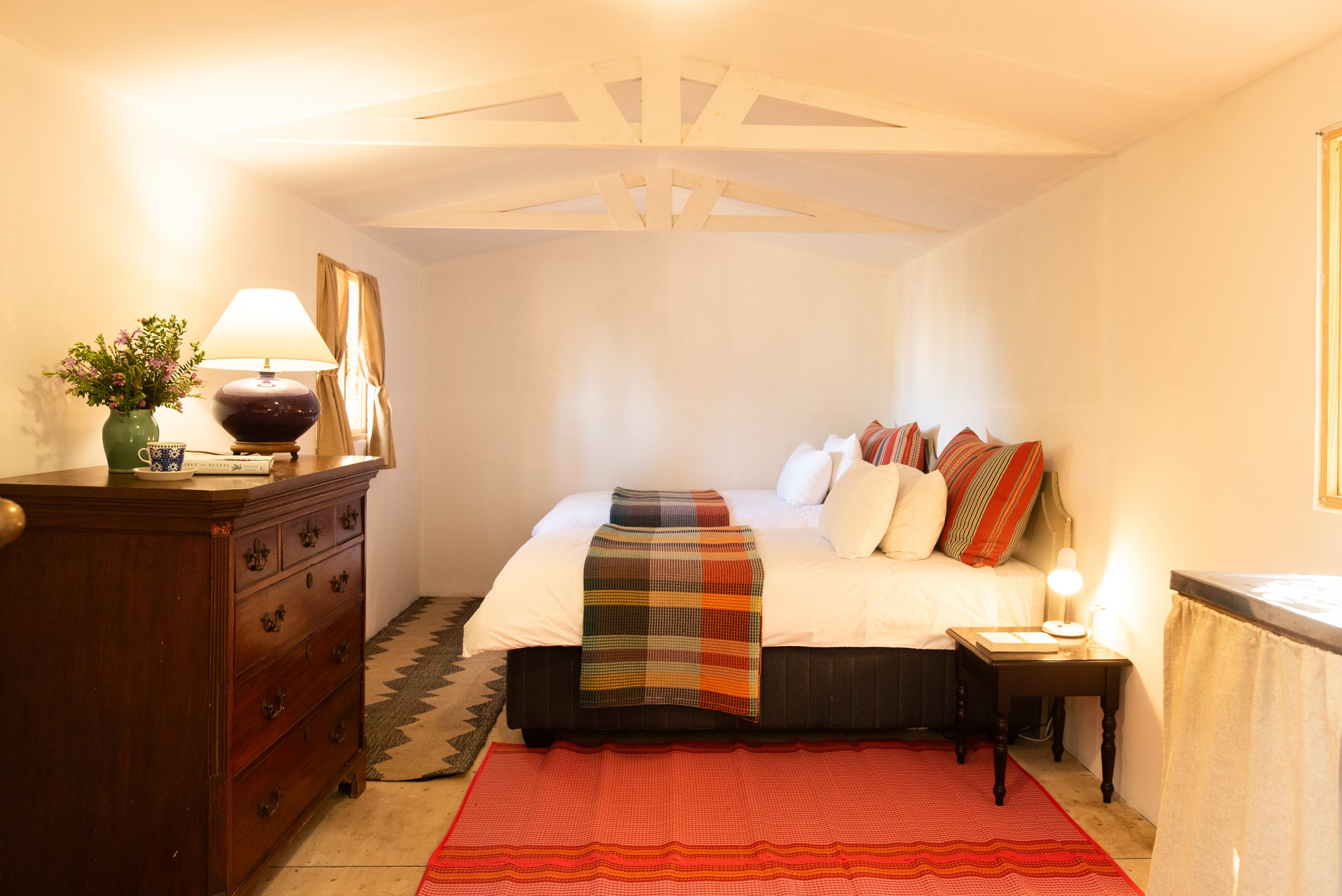 We have 2 beautiful double rooms that share a bathroom and both lead o the main sitting area. Sweet thorn is a smaller double room right next to the bathroom while Milkwood is a more spacious bedroom with its own door leading to the outside area and a bit further away from the shared bathroom.