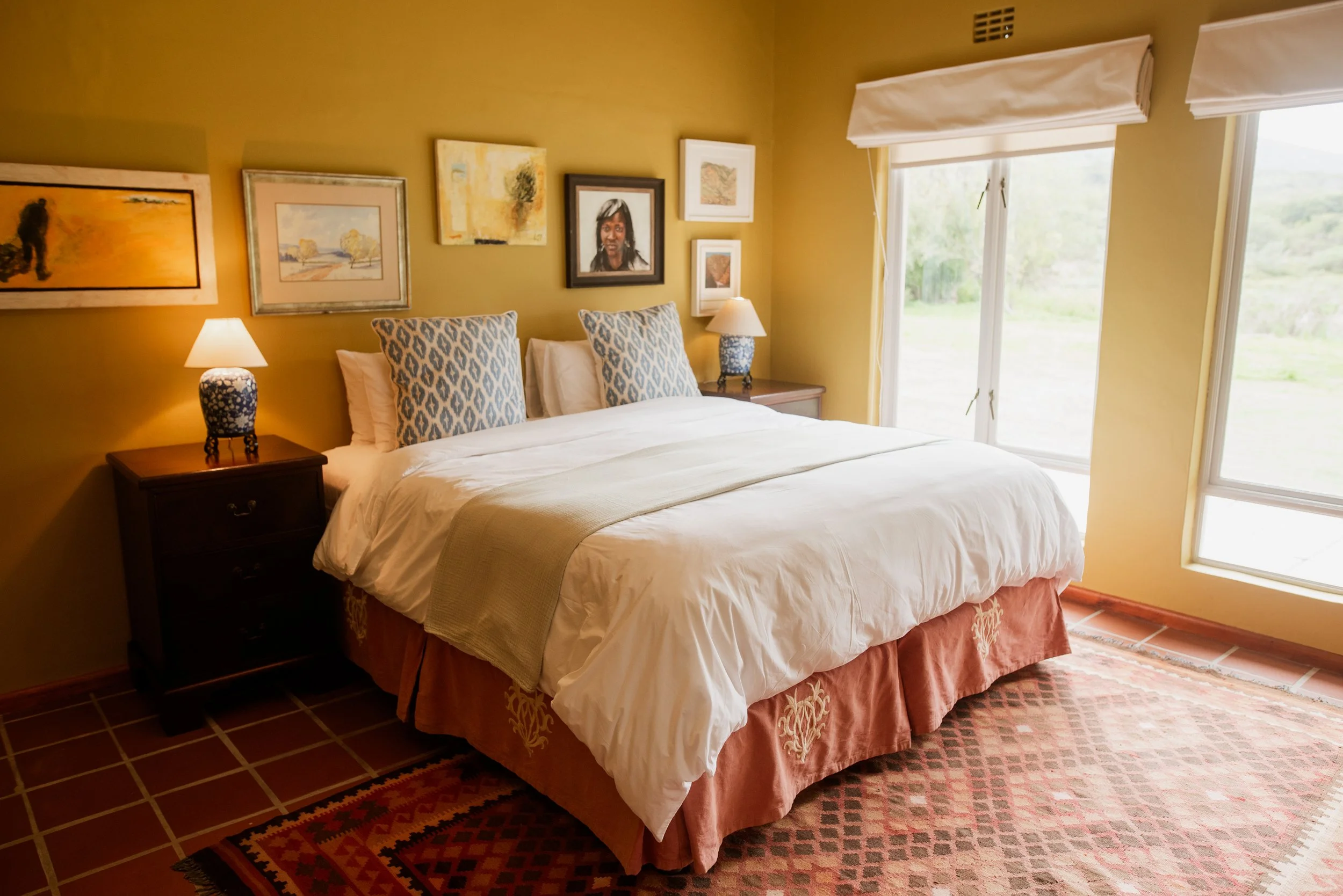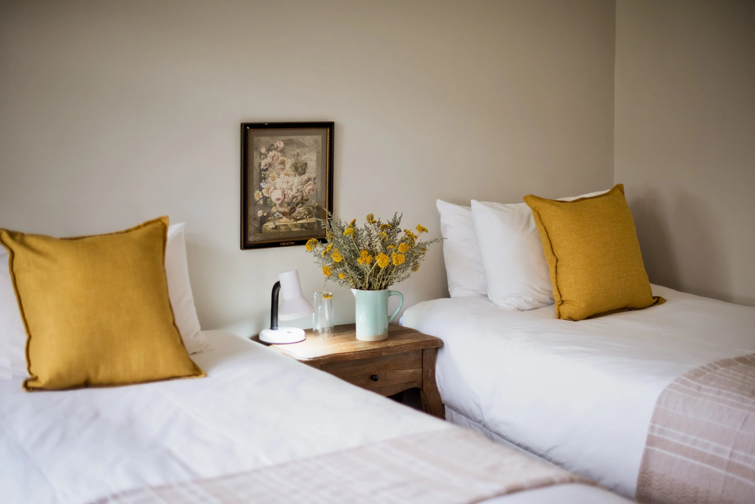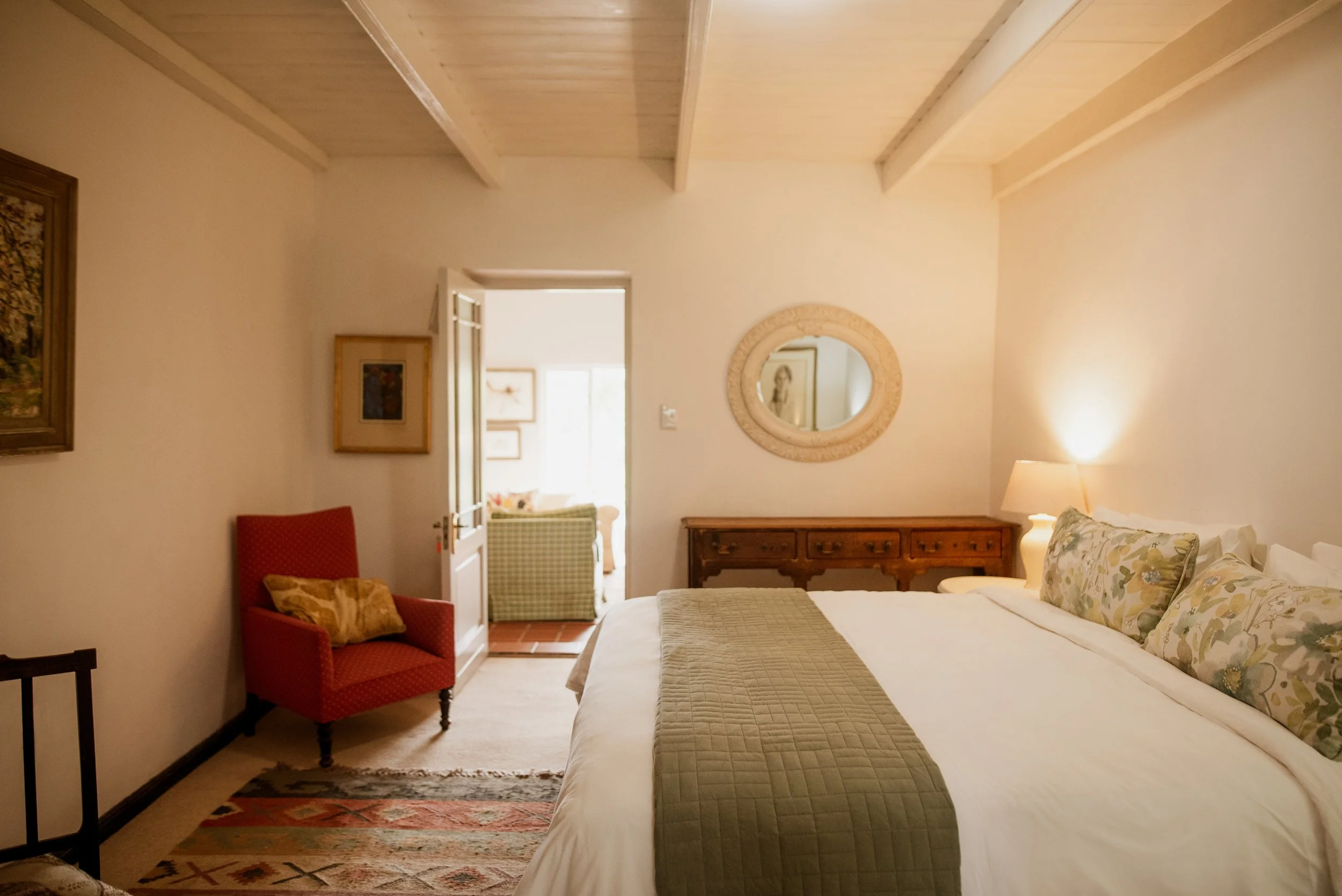 We have 2 beautiful double rooms that share a bathroom and both lead o the main sitting area. Sweet thorn is a smaller double room right next to the bathroom while Milkwood is a more spacious bedroom with its own door leading to the outside area and a bit further away from the shared bathroom.