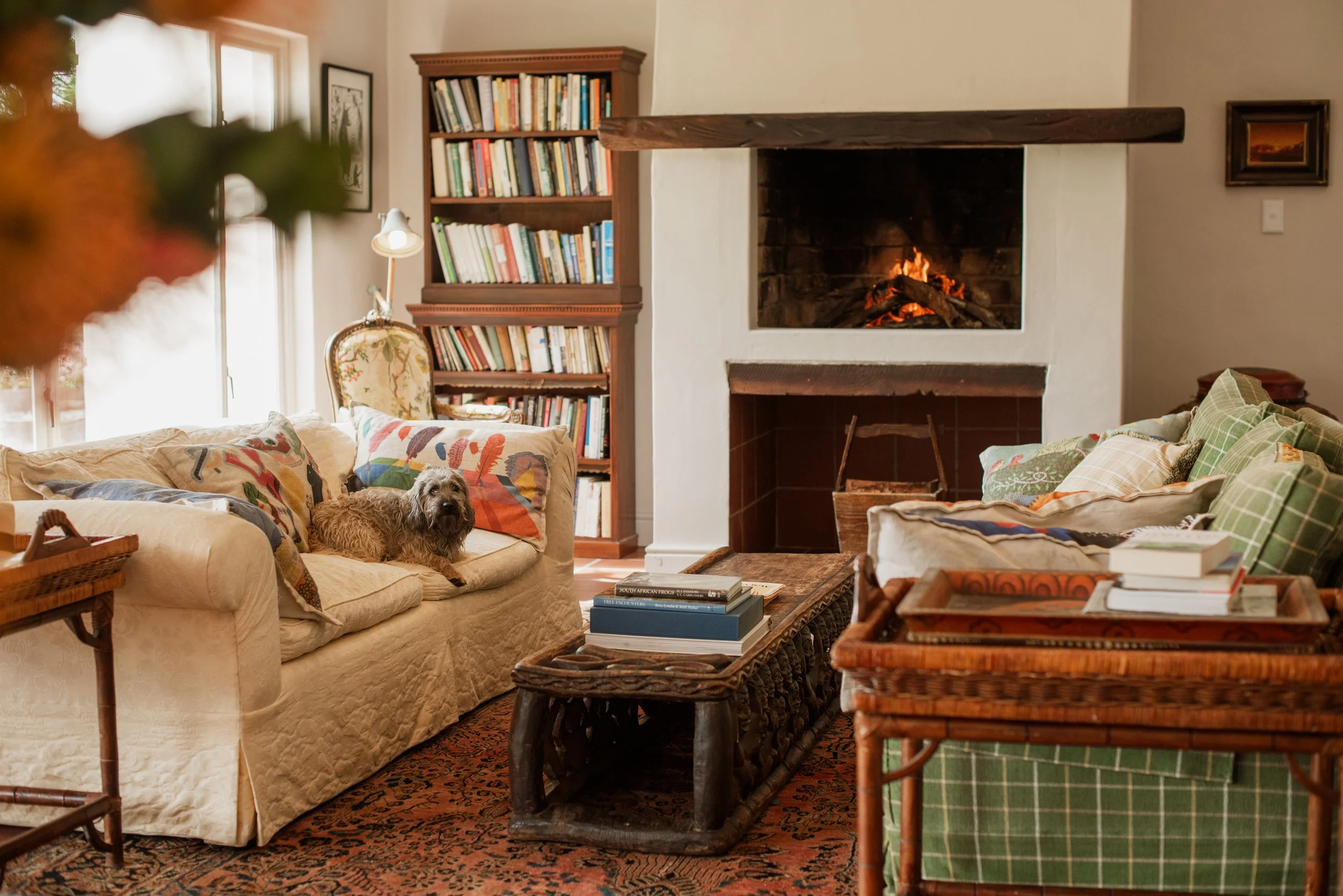 Our self-contained flatlet in the main house has its own bathroom and sitting room with a fireplace and back door leading outside. There is a comfortable double room as well as a single room in the flatlet.